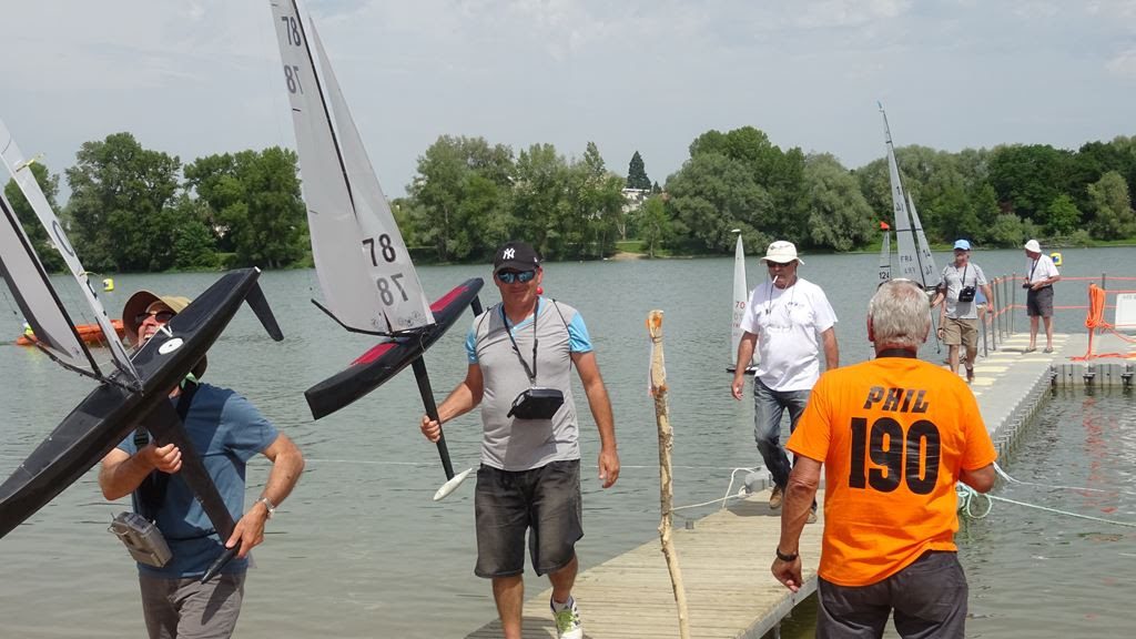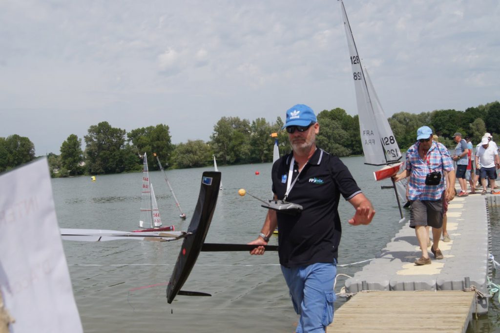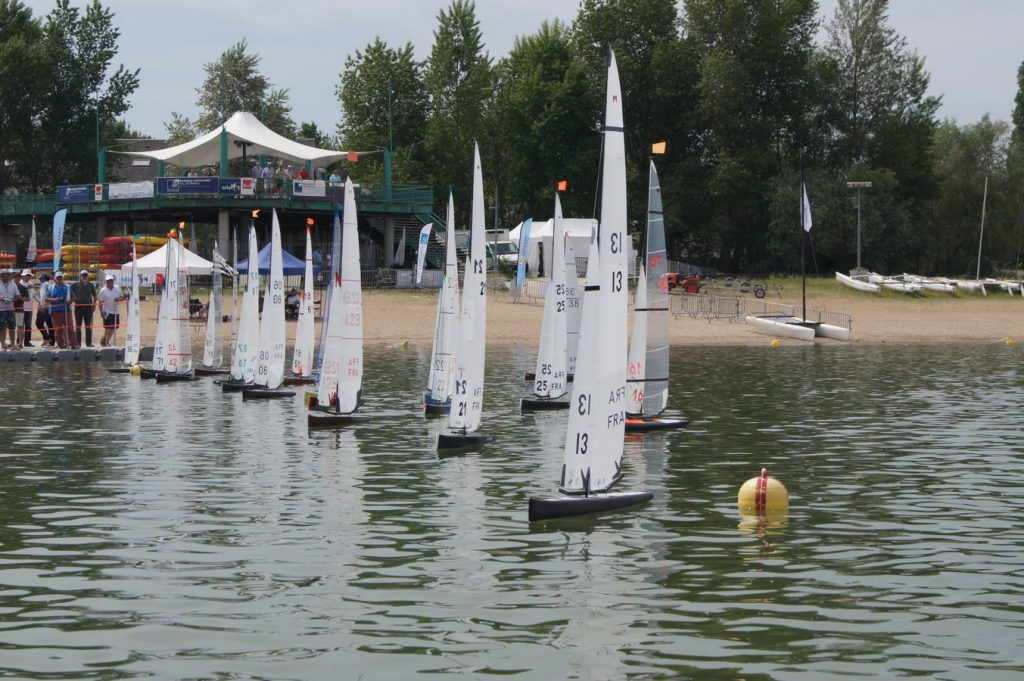 Les deux premiers jours avec du vent bien établi, puis baisse régulière le samedi pour finir avec….. plus rien en fin d’après-midi. Dimanche un peu d’air pour terminer une manche et faire une dernière course qui allait s’avérer décisive pour le titre. Ce plan d’eau qui avait déjà accueilli le championnat en 1992 est bien adapté à la VRC. Seul le pilotage depuis le ponton devient un peu juste quand tout le monde s’agglutine à une extrémité lorsque le parcours est décalé.