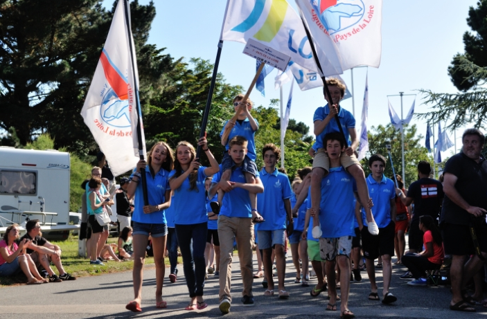 L’occasion d’effectuer les derniers réglages sur l’eau comme à terre, pour les coureurs mais également pour l’organisation. Tout doit être fin prêt pour le début de la compétition demain ! A 18h, les jeunes ont défilé sous les couleurs de la ligue sur le superbe site de l’ENVSN. 23 ligues sont représentées . Depuis deux ans maintenant, le championnat de France Minimes accueille donc cette flotte qui a la particularité d’être fournie par l’organisation. Economique, écologique et équitable, ce principe permet aux participants de voyager léger et d’éviter certaines contraintes logistiques.
