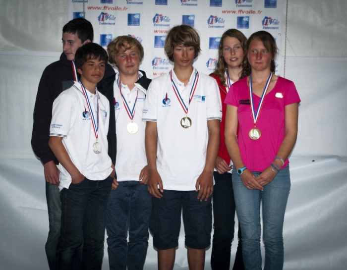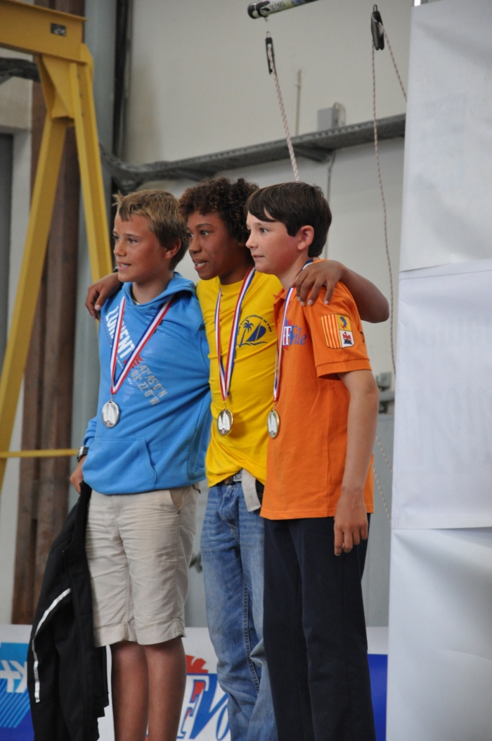 Merik (CS Bas du Fort) est Champion de France 2012 en Optimist N1. Gwendal (CNBPP) est deuxième et Maxime (CN Antibes) sur la troisième marche.